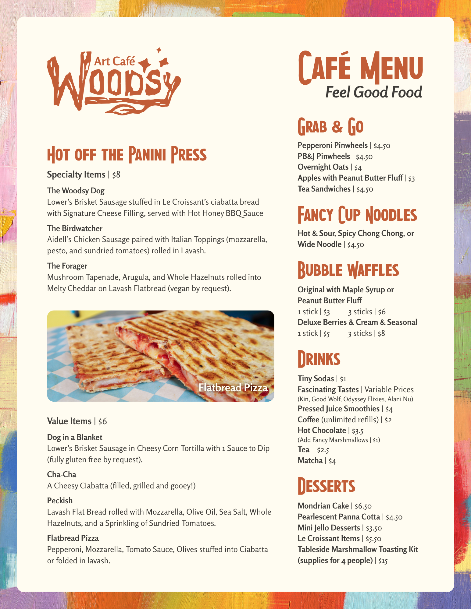 At Woodsy Art Café, every drink and bite is crafted to fuel creativity. Whether you’re sketching, studying, or socializing, you’ll find something comforting, colorful, and uniquely Woodsy.